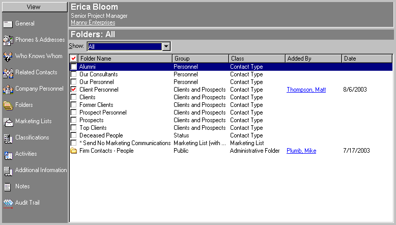 Folders allow you to organize your contacts. Each contact can be contained in any number of folders. InterAction also provides marketing lists which are special folders. You can view all the folders and marketing lists that contain a contact from the contact details for the contact.